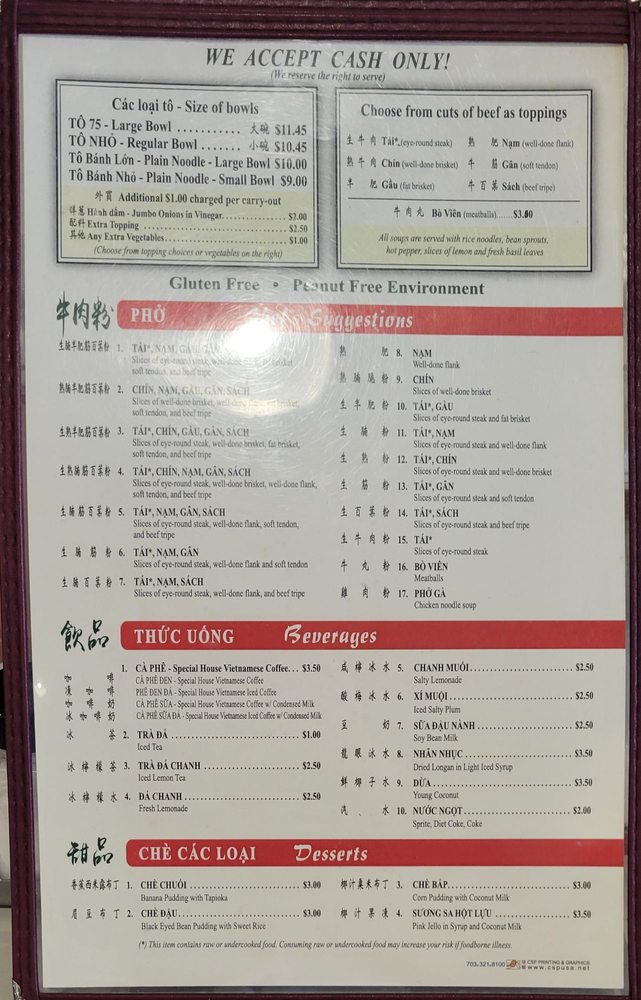 Pho 75 Restaurant in Herndon, VA, offers authentic Vietnamese cuisine with a focus on their delicious pho. Customers rave about the flavorful broth and fresh ingredients, such as eye of round steak, well-done brisket, and soft tendon. The menu also includes tasty desserts like dried logans in iced syrup and jello with beans and coconut milk. The casual ambiance, friendly service, and speedy delivery add to the overall dining experience. Many patrons appreciate the cash-only policy, giving the restaurant a unique charm. With reasonable prices and generous portions, Pho 75 is a go-to spot for a satisfying meal. Whether you're a pho enthusiast or looking to try Vietnamese cuisine, this restaurant is worth a visit.
